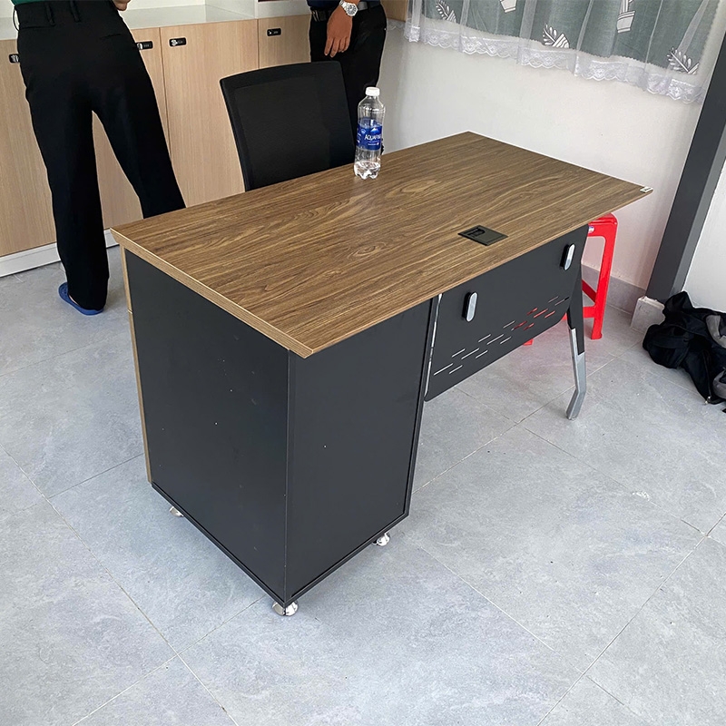 Bàn chuyên viên BRI120SHLC15 hộc liền cao cấp mặt gỗ melamine vát cạnh 45 độ hai cạnh dài, có yếm tôn, kết hợp chân bàn thép dập định hình sơn đen nhám kết hợp mạ.