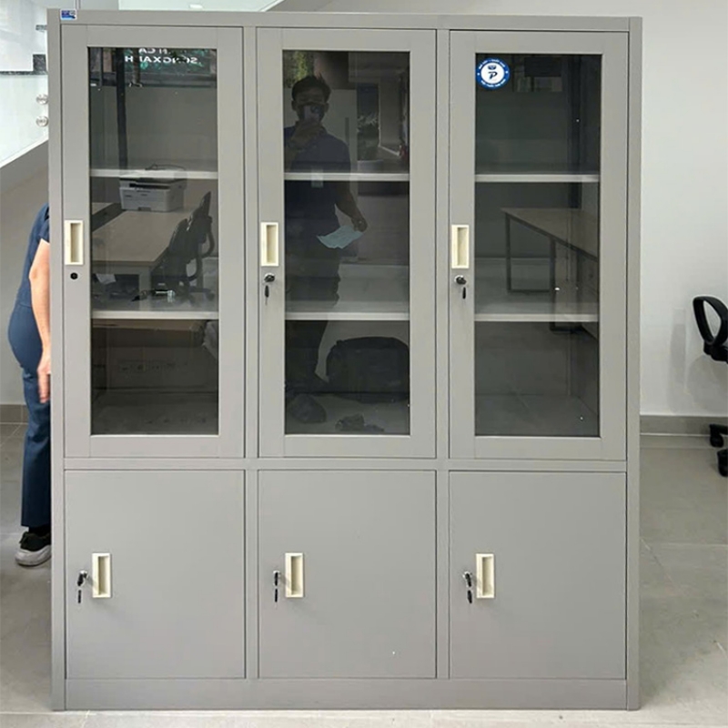 Tủ sắt sơn tĩnh điện TU09K7PCK gồm 6 khoang, bên trên là 3 khoang cánh kính mỗi khoang có 2 đợt cố định, bên dưới 3 khoang cánh sắt.