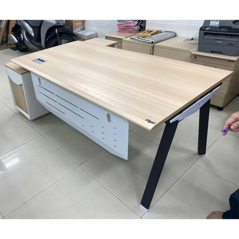 Bàn trưởng phòng khung chân C17 biên dạng mới có kết hợp yếm tôn, sử dụng gỗ laminate kết hợp melamine hoặc melamine toàn bộ. Bàn có trang bị tủ phụ liền ghép thành chữ L. Phụ kiện sử dụng cao cấp