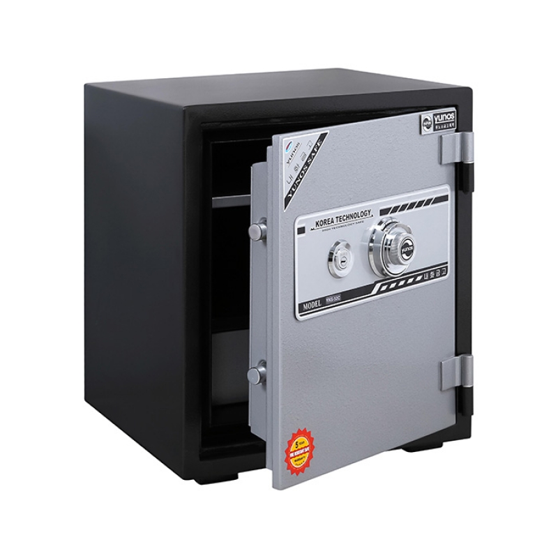 | Kiểu dáng | Két sắt có thiết kế hiện đại, nhỏ gọn với kích thước 510 x 420 x 480 mm, phù hợp cho gia đình và văn phòng. Vỏ ngoài sơn tĩnh điện với phần cánh màu xám bạc hoặc vàng ánh kim kết hợp phần thân màu đen chì tạo vẻ ngoài sang trọng và chắc chắn. Cửa két dày dặn, sử dụng khóa chìa bi kết hợp khóa cơ truyền thống, đi kèm chốt đặc ruột ăn sâu vào thân két, đảm bảo an toàn tối đa. Logo Yunos và nhãn "Korea Technology" được in nổi bật, tăng tính thẩm mỹ và độ tin cậy. Trọng lượng: ~85kg |