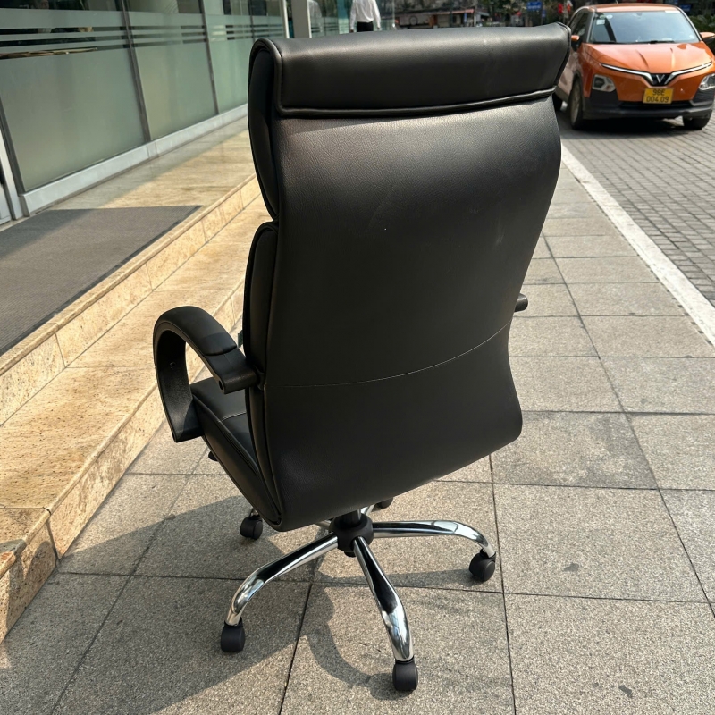 Tựa lưng cao tích hợp tựa đầu êm ái giúp hỗ trợ nâng đỡ cổ và vai gáy. Phần đệm ngồi và tựa lưng được bọc da PU cao cấp tạo cảm giác êm ái. Hai tay ghế cong nhẹ mang lại sự vững chắc và thẩm mỹ cao. Chân ghế bằng thép kết hợp bánh xe linh hoạt dễ dàng di chuyển. Toàn bộ thiết kế mang phong cách lịch lãm, phù hợp cho không gian phòng giám đốc, trưởng phòng hoặc văn phòng làm việc cao cấp.
