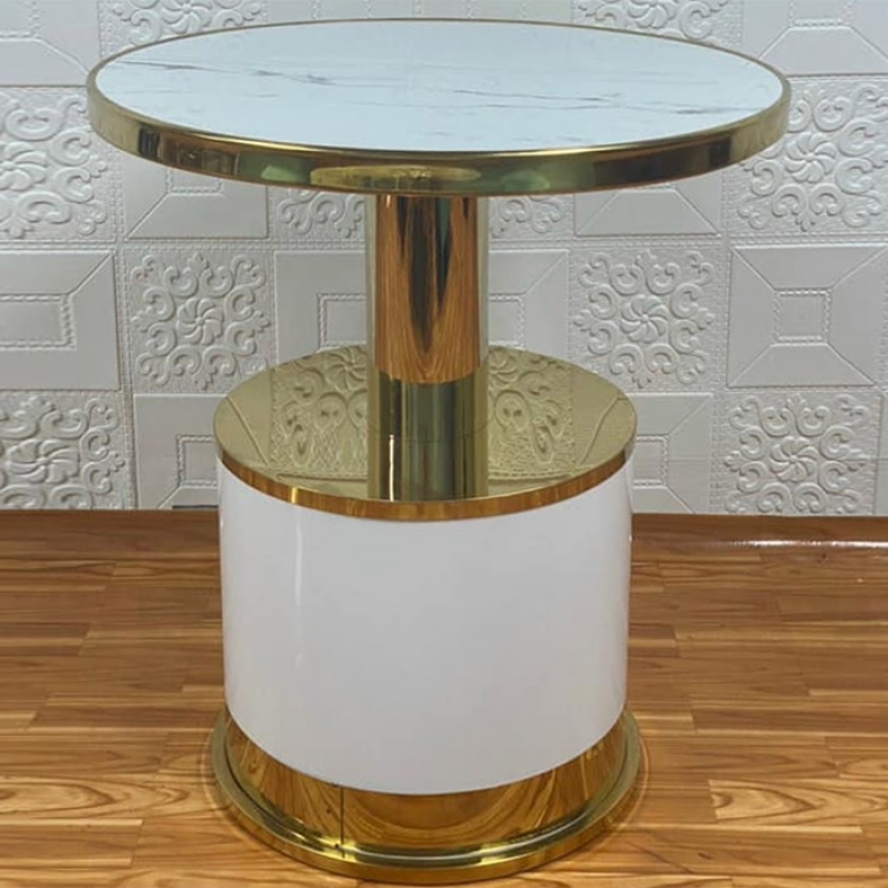 Điểm nổi bật tiếp theo là khung viền và chân trụ được chế tác từ inox mạ vàng, tạo nên sự sang trọng và bắt mắt. Lớp mạ vàng bóng bẩy không chỉ tăng tính thẩm mỹ mà còn chống ăn mòn, giúp bàn cafe duy trì độ bền đẹp trong nhiều năm. Phần thân trắng từ sắt sơn tĩnh điện mang đến sự chắc chắn và hài hòa với tổng thể thiết kế. Sự kết hợp này làm sản phẩm nổi bật trong không gian phòng khách, quán cà phê, hoặc thường được sử dụng cho khu pantry tại các công ty với sự tiện nghi và phong cách.