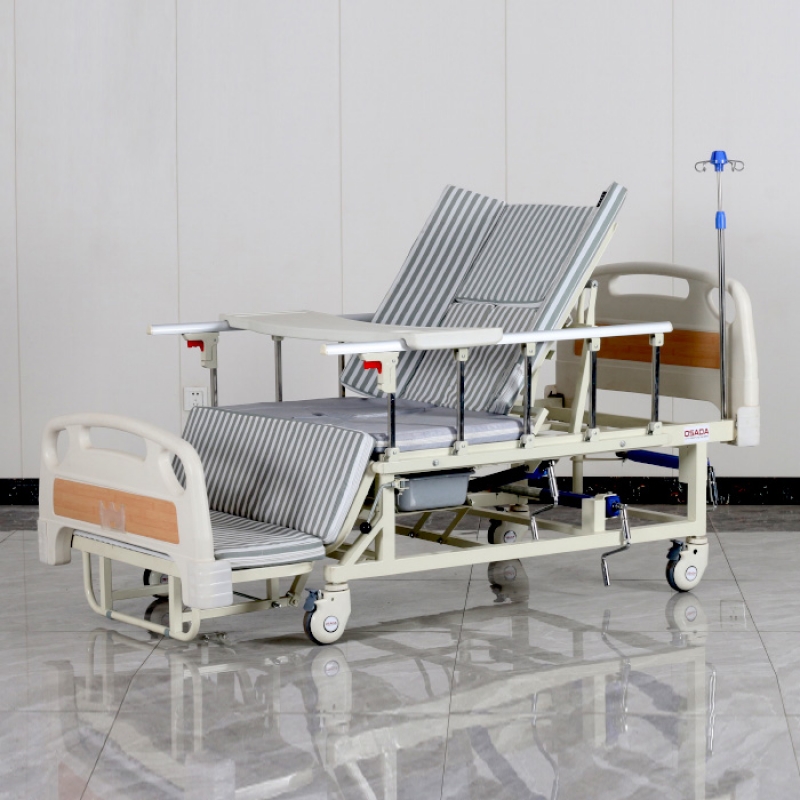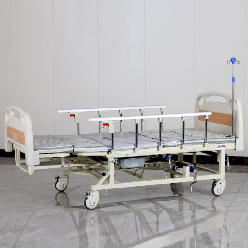 Giường bệnh nhân với cơ cấu vận hành bằng 3 tay quay và 1 cần gạt chắc năng bô. Điều chỉnh nâng hạ đầu 0-80°, điều chỉnh nâng chân 0-40°, hạ chân 40°, lật người nghiêng trái - phải, có trang bị bô vệ sinh + bàn ăn lắp ráp + cây truyền dịch điều chỉnh độ cao + đệm mút xơ dừa dày 6cm và vỏ ga bẳng vải cotton. Giường có bánh xe giúp di chuyển và xoay 360 độ tiện dụng |