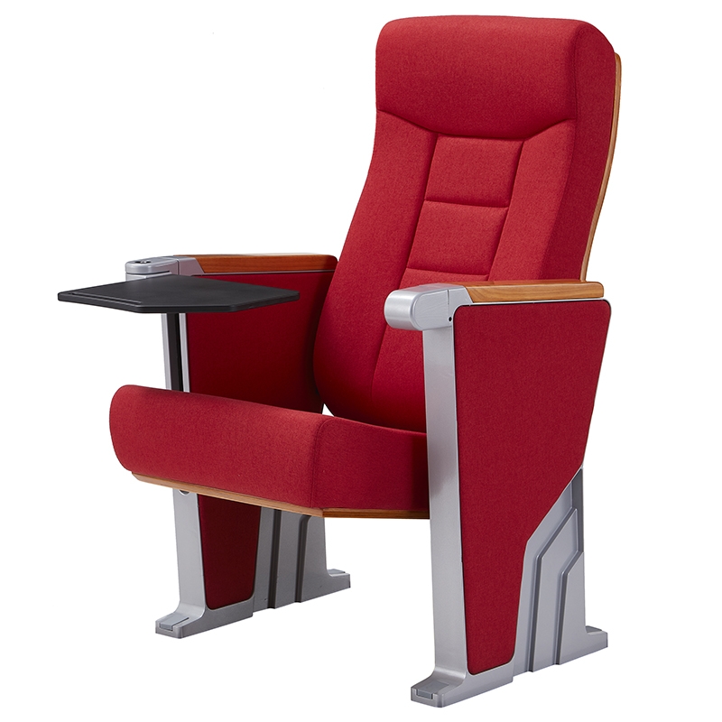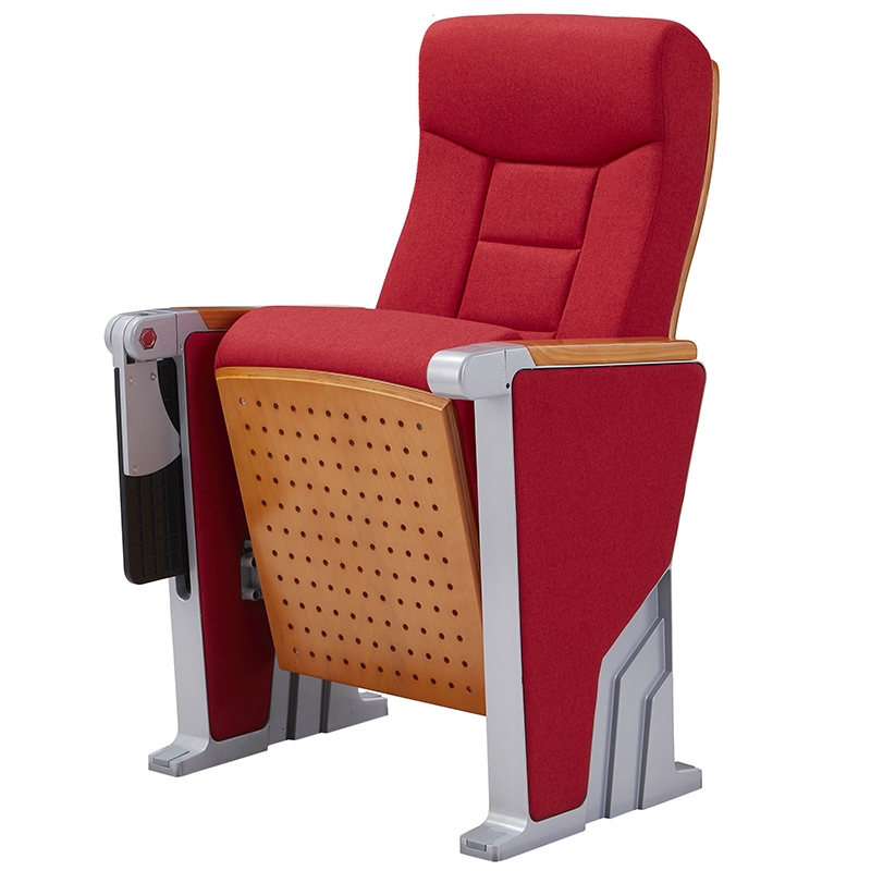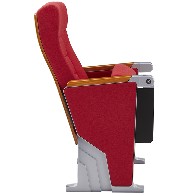 Kiểu dáng Ghế hội trường lưng cao ôm sát cơ thể, may trang trí tạo múi thẩm mỹ. Ốp lưng & ốp đệm gỗ tự nhiên tinh tế. Tay vịn gỗ tích hợp bàn viết ẩn gập xoay mượt, khung nhôm đúc chắc chắn cố định sàn. Đệm ngồi có trang bị cơ chế gấp gọn tự động, phù hợp không gian hội nghị cao cấp.