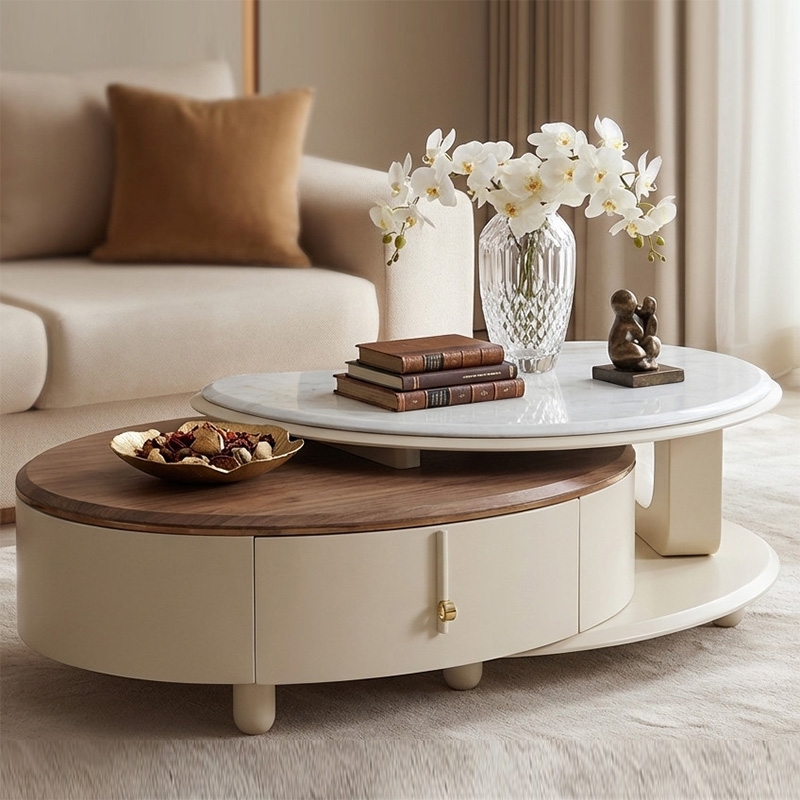 Kiểu dáng Bàn sofa cao cấp, gồm 2 mặt bàn bo tròn elip, mặt đá và mặt gỗ, bàn có ngăn kéo. Hàng nhập khẩu.