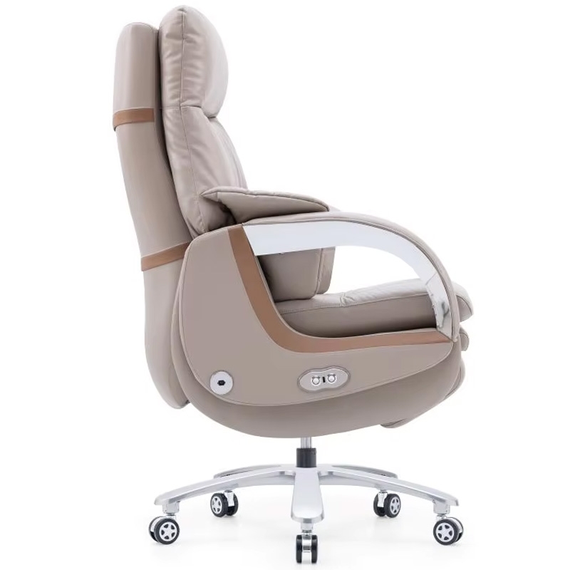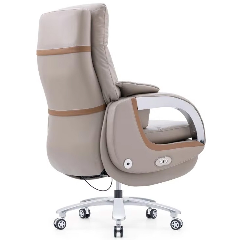 Ghế làm việc dành cho lãnh đạo điều khiển ngả lưng điện, trang bị gác chân gấp gọn linh hoạt, có chế độ massage 2 mức thư giãn thoải mái. Phần đệm tựa bọc da thật dày dặn, êm ái, ôm sát cơ thể. Đường nét bo tròn mềm mại tạo cảm giác thanh lịch.