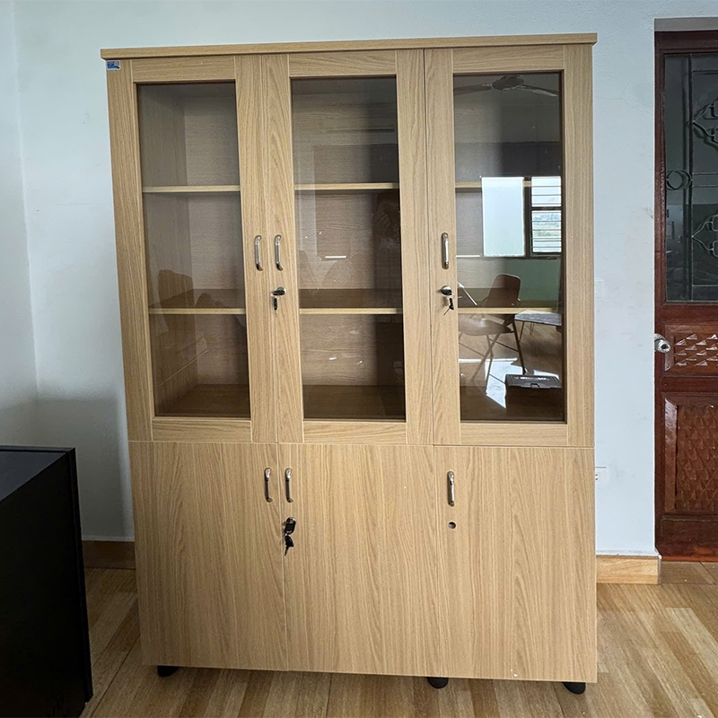 Tủ tài liệu 3 khoang chất liệu gỗ công nghiệp phủ melamine, bên trên gồm 3 khoang khung cánh kính có khóa, trong có 2 đợt di động.