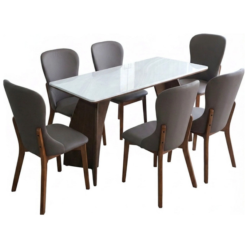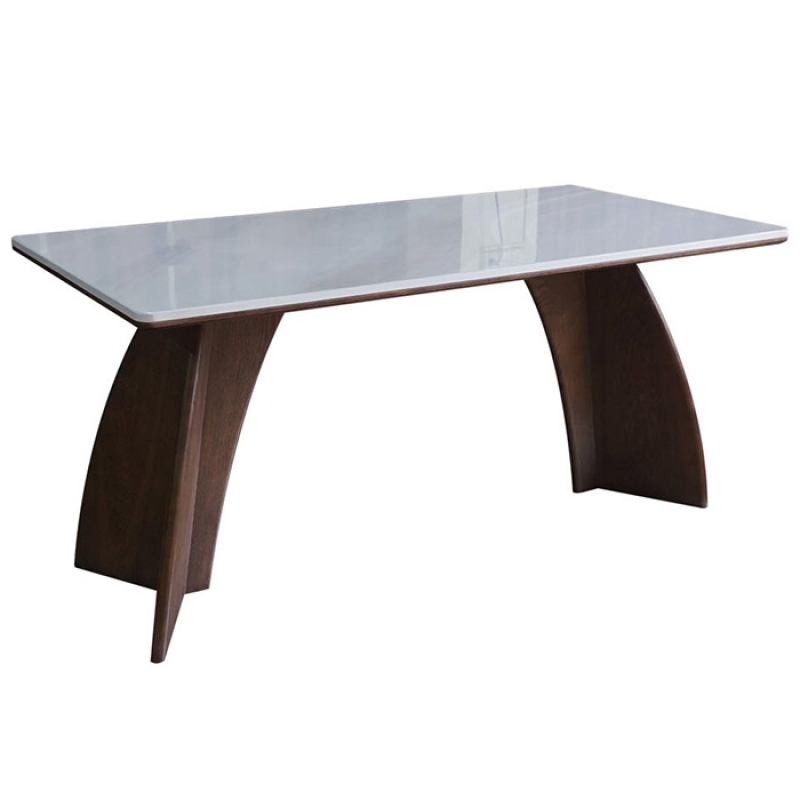 Kiểu dáng Bàn ăn cao cấp, mặt đá nhân tạo vân núi sáng, bên dưới có ốp mặt gỗ, chân gỗ tự nhiên sơn màu vân gỗ.