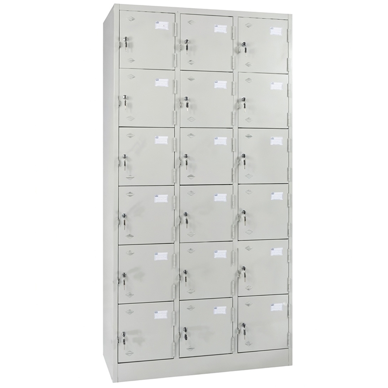Tủ sắt sơn tĩnh điện 18 khoang, cánh mở, không đợt, mỗi khoang có khóa riêng và có tai móc khóa ngoài.