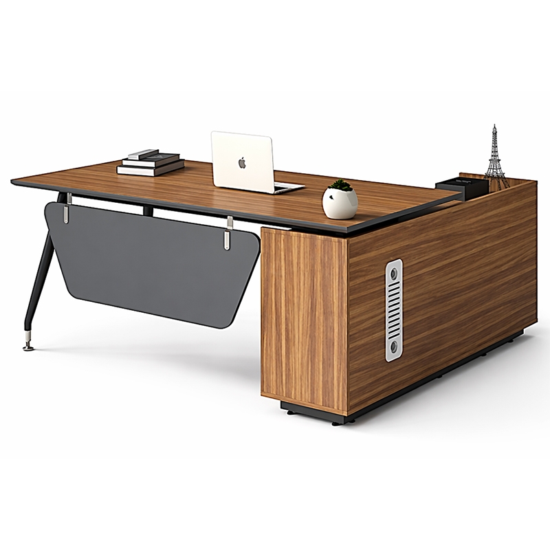 Kiểu dáng Bàn giám đốc kiểu chân 1908, có 1 tủ phụ liền, khoang cánh mở, 1 khoang giá CPU, 1 khoang giá sách. Mặt bàn gỗ CN Melamine, có nắp nhôm điện, khung chân sơn đen